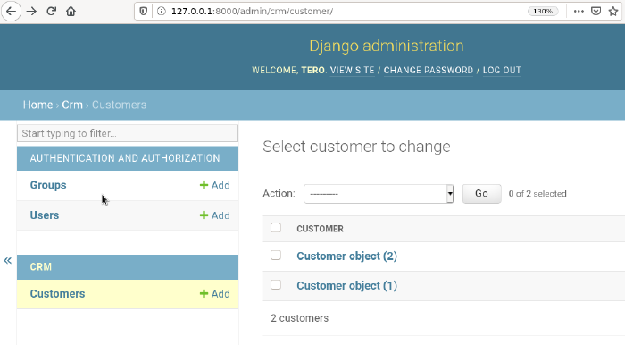 Let's make the admin interface show our customer's names also in list. Edit the existing models.py, where we've described Customer class.