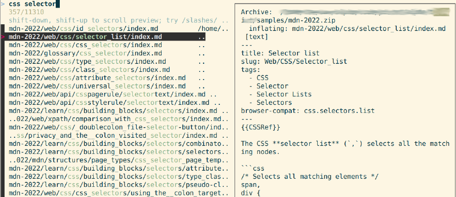 What's an <article> and how do I upload a file? What if you could have a copy of Mozilla Developer Network at your fingertips, offline. You can keep your hands on the keyboard, it's TUI with interactive, real time fuzzy search.