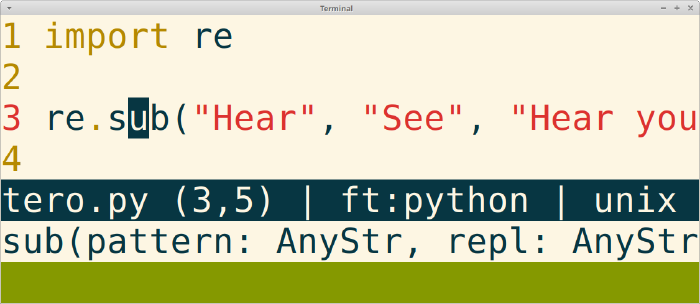 re.sub("Hear", "See", "Hear you at TeroKarvinen.com")