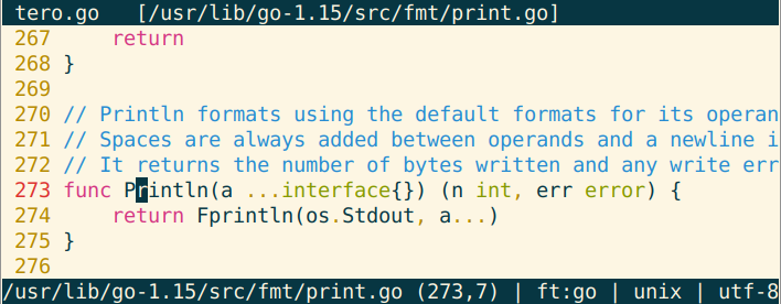 Keep cursor over Println and press Alt-D. The file defining fmt.Println opens in a new micro tab. This file comes from Go built-in libraries. Cursor is already moved to correct position. Press left or right to move view to correct place.